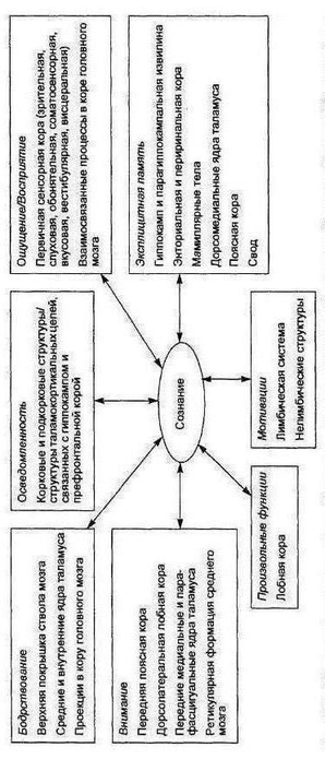 Любым произвольным (субъективным, осознанным) действиям человека соответствует определенный паттерн нейронной активности в различных областях мозга. Сознательный жизненный опыт является результатом взаимодействия значительного количества распределенных областей мозга, которые вовлечены в процессы внимания, восприятия, памяти и целенаправленного действия. Поэтому под нервными коррелятами сознания понимают совпадение паттернов активности (электрической или метаболической) между разделенными и расположенными на расстоянии друг от друга полями коры головного мозга при различных состояниях сознания. Например, сознание тесно коррелирует с состоянием сна и бодрствования, зрительным осознанием (синоним осведомленность) человека, а также вниманием, восприятием, памятью и мыслительными функциями мозга. Совпадение паттернов активности (электрической или метаболической) между распределенными полями коры головного мозга коррелирует с состоянием сознания и обуславливает индивидуальную форму отражения действительности (сознание) и способность осознавать психическую деятельность (самосознание). (рис.1)