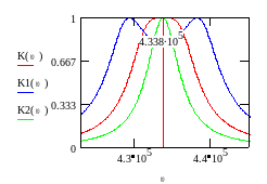 ЧХ нормированного тока вторичного контура при трех значениях коэффициента связи Ксв = 0.5Ккр (зеленая кривая на графике), Ксв = Ккр (красная кривая на графике), Ксв = 2Ккр (синяя кривая на графике), где Ккр – критический коэффициент связи.