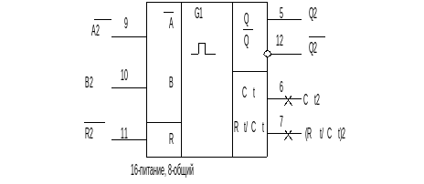 Тактовый генератор реализуем на микросхеме К555Г3, которая представляет собой два ждущих мультивибратора с возможностью перезапуска. Каждый из мультивибраторов представляет собой триггер с двумя выходами Q и Q и дополнительной логикой на входе, имеющей три входа: вход сброса R (активный уровень -низкий) и два входа запуска А и В. Вход А – инверсный с активным низким уровнем, а вход В – прямой с активным высоким уровнем напряжения. Длительность выходного импульса можно рассчитать по формуле:
