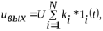 Один из возможных законов. Сложение сигналов с равными амплитудами. Для простоты предположим, что Ui=U и первый импульс приходит в момент t=T0. Форму выходного сигнала можно определить, составив таблицу состояний триггеров и суммируя напряжения каскадов. Напряжение на выходе схемы может принимать только N+1 значений. Вероятности появления на выходе схемы различных уровней напряжений будут различными. Последнее обстоятельство, а также весьма ограниченный набор возможных уровней напряжения и неравномерность спектра сигнала являются его недостатком. Улучшить качество сигнала можно, сделав амплитуды суммарных сигналов Uki различными.