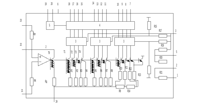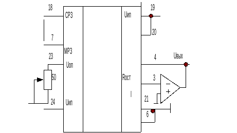 Наличие в ИС резисторов обратной связи и резистора сдвига уровня ОУ позволяет применять ИС К594ПА1 в режимах однополярного и двухполярного выходных сигналов. На рисeнке приведена схема включения ЦАП в режиме однополярного сигнала для работы с ТТЛ цифровыми сигналами. В этой схеме резистор R19 (10,5 кОм) включается в цепь ООС ОУ. В режиме двухполярного выходного сигнала в цепь ООС ОУ включаются резисторы R19, R20, (10,5—2,5 кОм), а инвертирующий вход ОУ через резистор R21 присоединяется к источнику опорного напряжения через переменный резистор, который необходим для компенсации первичных ошибок ЦАП. ИС К594ПА1 может применяться и для преобразования цифрового кода, поступающего от КМОП ЦИС.