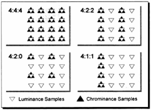 В рассмотренных четырех профилях при кодировании сигналов яркости и цветности используется формат представления видеоданных 4:2:0, в котором число отсчетов сигналов цветности по сравнению с сигналом яркости уменьшается в два раза не только по горизонтальным, но и по вертикальным направлениям. Следующий, пятый профиль называется высшим профилем, и он включает в себя все функциональные операции специального профиля 4:2:2, при котором число отсчетов сигналов цветности в вертикальных направлениях остается тем же, что и у сигнала яркости (см. рис.).