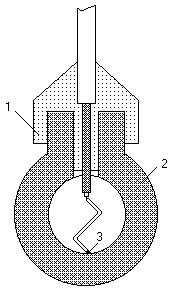 Пьезокерамический сферический преобразователь (Рис.1) представляет собой оболочку 2 (однородную или склеенную из двух полусфер), поляризованную по толщине, с электродами на внутренней и внешней поверхностях. Вывод от внутреннего электрода 3 проходит через отверстие и сальник 1, вклеенный в оболочке.