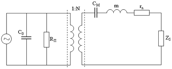 Электромеханическая схема нагруженной сферы. Учесть нагрузку преобразователя можно включением сопротивления излучения