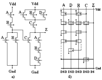На рис. 1.а представлена транзисторная схема, а на рис. 1.б - транзисторная матрица, реализующая данную схему.