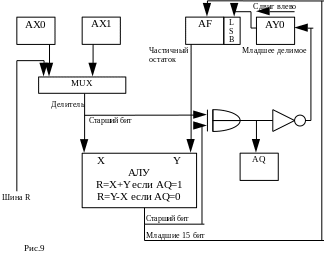 Второй примитив деления – инструкция "делить частное" (DIVQ), которая генерирует 1 бит частного за цикл и выполняется повторно, чтобы подсчитать оставшиеся разряды частного. Для беззнакового деления с одинарной точностью инструкция DIVQ выполняется 16 раз, чтобы получить 16 бит частного. Для знакового деления с одинарной точностью инструкция DI VQ выполняется 15 раз, после вычисления знакового бита инструкцией DI VS. Инструкция сдвигает регистр AYO влево на 1 бит так, что новый бит частного помещается в младший бит. Состояние флага АQ (полученное во время предыдущих операций) определяет инструкцию, используемую для получения частичного остатка. Если AQ=1, то АЛУ добавляет делитель к частичному остатку в AF. Если AQ=O, то АЛУ вычитает делитель из частичного остатка в AF. Регистр результата К загружается со смещением в AF так, как это описано для инструкции DIVS. Флаг AQ считается как исключающее логическое или (XOR) старшего бита делителя и старшего бита регистра результата АЛУ, а очередной бит частного получается инвертированием этого значения. Полученный бит частного загружается в младший бит регистра АYО, который затем сдвигается влево на 1 бит. Рисунок 9 иллюстрирует операцию DlVQ.