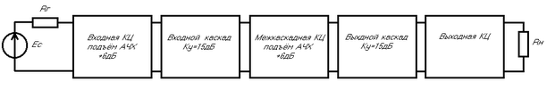 Расчёт усилителя будем проводить исходя из того, что искажения распределены следующим образом: выходная КЦ–1 дБ, выходной каскад с межкаскадной КЦ–1.5 дБ, входной каскад со входной КЦ–0.5 дБ. Таким образом, максимальная неравномерность АЧХ усилителя не превысит 3 дБ.