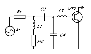 Схема входной КЦ представлена на рисунке 3.10. Её расчёт, а также табличные значения аналогичны описанным в пункте 3.5.1. Отличие в том, что табличные значения не требуют пересчёта, так как ёмкость слева от КЦ равна 0, а справа – . Поэтому денормировав эти значения мы сразу получим элементы КЦ. Денормируем величины относительно сопротивления генератора сигнала