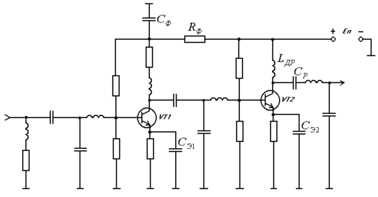 Дроссель в коллекторной цепи выходного каскада ставится для того, чтобы выход транзистора по переменному току не был заземлен. Его величина выбирается исходя из условия: