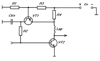 Величина индуктивности дросселя выбирается таким образом, чтобы переменная составляющая тока не заземлялась через источник питания, а величина блокировочной ёмкости – таким образом, чтобы коллектор транзистора VT1 по переменному току был заземлён.