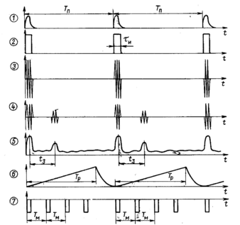 инхронизатор РЛС вырабатывает периодическую последовательность импуль-сов с периодом Tn=3,6 10-3, которые воздействуют одновременно (либо с некоторым постоянным запаздыванием) на модулятор, генератор развертки дальности и генератор масштабных импульсов. Импульсный модулятор вырабатывает модулирующие видеоимпульсы длительностью tu=1,7 10-6, воздействующие на генератор СВЧ. Последний вырабатывает радиоимпульсы примерно такой же длительности.Генератор СВЧ формирует периодическую последовательность радиоимпульсов, излучаемую антенной в виде зондирующего сигнала. Отраженный импульс появляется на входе приемника через интервал времени tз. На выходе приемника образуются видеоимпульсы, смешанные с шумом, которые подаются на управляющий электрод ЭЛТ.