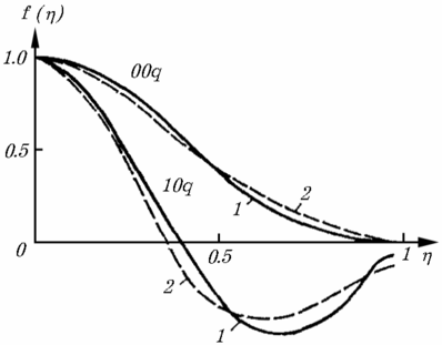 . Вблизи оси плотность тока, описываемая гиперсфероидальными функциями (кривые 1), практически не отличаются от экспоненциальной функции, умноженной на полиномы Лагерра (кривые 2), т. е. от гауссова пучка [68]. Радиальное распределение отличается только масштабом по радиусу.