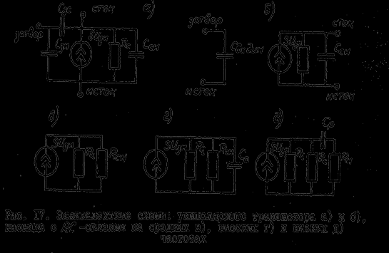 При анализе работы схем на униполярных транзисторах по переменному току используется малосигнальная эквивалентная схема транзистора, изображенная на рис. 17а. Здесь Ri – внутреннее дифференциальное сопротивление транзистора (сопротивление канала), S- крутизна стоко-затворной характеристики в рабочей точке, Сзн, Сзс и Ccн - межэлектродные емкости транзистора, называемые соответственно входной, проходной и выходной. Эту схему можно преобразовать в эквивалентную ей (рис. 17б), в которой фигурирует входная динамическая емкость транзистора Свхдин, определяемая соотношением Свхдин=Сзн+Сзс(1+К), где К - коэффициент усиления каскада по напряжению. На рис. 17в-д показаны эквивалентные схемы усилительного каскада отдельно для средних, высоких и низких частот. На средних частотах, когда реактивные компоненты схемы можно не учитывать, нетрудно получить формулу для коэффициента усиления по напряжению кu0=S(Ri||Rc||Rн). Учитывая, что в большинстве случаев Ri>>Rc и Rн>>Rc, кu0SRс.