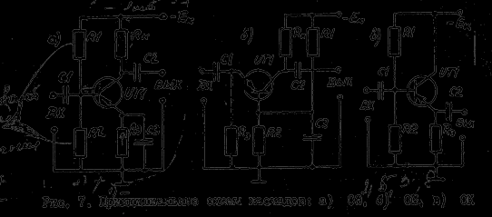 В транзисторных схемах источник сигнала может включаться в цепь базы или эмиттера, нагрузка - в цепь коллектора или эмиттера, а третий электрод транзистора оказывается общим для входной и выходной цепи. В зависимости от того, какой электрод транзистора оказывается общим, различают схемы ОЭ (о общим эмиттером), ОБ (с общей базой) и ОК (с общим коллектором), показанные на рис. 7.