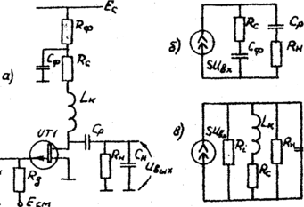 Добавление дросселя Lк (элемент высокочастотной коррекции в стоковой цепи транзистора) позволяет получить в выходной цепи усилителя параллельный колебательный контур (рис. 18в). резонирующий на частоте
