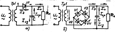 Рис. 2. Схемы выпрямителей: а - однополупериодного, б – двухполупериодного (мостового)