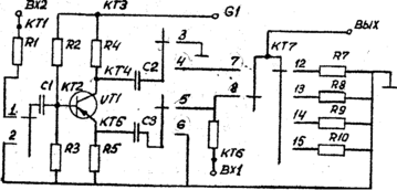В исследуемой схеме стоит маломощный низкочастотный транзистор МП42А ( fh21б = 13 мГц, В= 3050, rб= 200 Ом, Ск = 30 пФ, Ркмакс =200 мВт). Резисторы и конденсаторы имеют следующие номиналы: R1=1 кОм, R2=11 кОм, R3=5.1 кОм, R4=R5=R9=3.6 кОм, R6=470 Ом, R7=20 Ом, R8=510 Ом, R10=10 кОм, С1=С2=С3=20 мкф.