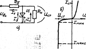 Рис. 5. Параметрический стабилизатор (а) и вольт-амперная характеристика стабилитрона (б)