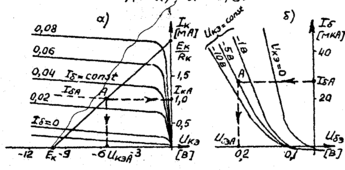 Рис. 8 . Статические вольт-амперные характеристики транзистора: а) выходные, б) входные.