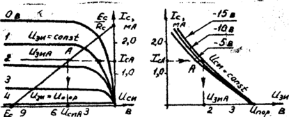 ри анализе работы усилителей на первом этапе рассматривают работу схемы на постоянном токе, т.е. определяют положение рабочей точки транзистора ( Ic, Ucн, Uзн), а также токи и напряжения для остальных ветвей схемы. Это часто и наиболее просто осуществляется графоаналитическим методом, предполагающим построение нагрузочной прямой Ic=(Ec-Uсн)/Rc и динамической стоко-затворной характеристики транзистора Ic=f1(Uзн) при Rc=const, на которых намечают положение рабочей точки. В свою очередь, нагрузочная прямая и динамическая стоко-затворная характеристика предварительно строятся на семействах статических стоковых Ic=f1(Uсн) при Uзн =const и стоко-затворных Ic=f2(Uзн) при Uсн =const характеристик. На рис. 16 приведен примерный вид таких характеристик для униполярного транзистора.От положения рабочей точки транзистора усилительного каскада зависят параметры транзистора, а следовательно, и параметры усилителя, такие, например, как коэффициент усиления по напряжению кu0, допустимая величина входного напряжения Uвхмакс превышение которой ведет к искажению выходного сигнала, коэффициент полезного действия и т.д. При заданных Ес и Rc изменить положение рабочей точки транзистора можно только за счет изменения напряжения источника Есм (см.рис.15).