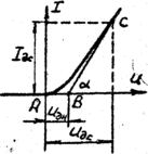На рис. 2а представлена схема однополупериодного выпрямителя с полупроводниковым выпрямительным диодом V. Как известно, вольтамперная характеристика (BAX) выпрямительного диода имеет вид, представленный на рис. 3. Для упрощения практических расчетов ее часто представляют на основе кусочно-линейной аппроксимации двумя .участками прямых АВ и ВС , причем АВ идет по оси абсцисс, а наклон ВС определяется средним, прямым сопротивлением диода