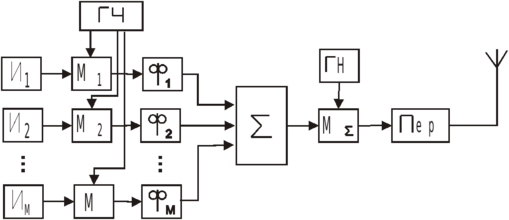 Для формирования канальных сигналов с неперекрывающимися спектрами осуществляется перенос спектров сообщений с помощью канальных модуляторов (Мi). На каждый модулятор подаются сообщение λk(t) и колебание sk(t)=akcos(ωkt + φk) от генератора поднесущих частот (ГЧ) (рис. 2.1.2). Канальные сигналы подаются на фильтры, полосы которых согласованы со спектрами этих сигналов. Фильтры подавляют гармоники, образующиеся в канальных модуляторах. В суммирующем устройстве складываются канальные сигналы, и групповой сигнал, спектр которого показан на рис. 2.1.1,б, модулирует несущую, вырабатываемую генератором (ГН). На выходе модулятора МΣ образуется радиосигнал с несущей ω0.
