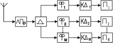 На приемной стороне после усиления и преобразования сигнала в ЛПр производится выделение группового сигнала с помощью демодулятора (Д). Групповой сигнал подается на устройство разделения, состоящее из параллельно включенных фильтров Ф1, Ф2,…, ФМ. На рис. 2.1.1,б параболами обозначены характеристики затухания фильтров. На выходе каждого фильтра выделяется соответствующий канальный сигнал вместе с продуктами взаимных помех и шумами. Канальные демодуляторы (КДi) выделяют переданные сообщения, направляемые далее получателям Пi.