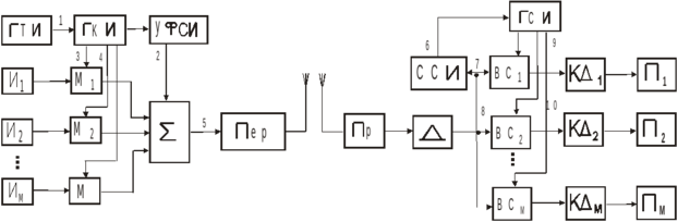 Для того чтобы обеспечить разделение каналов, на передающей стороне устройство формирования синхроимпульсов (УФСИ) вырабатывает синхроимпульсы, параметры которых отличаются от канальных импульсов, а период повторения совпадает с периодом Тп. Синхроимпульсы складываются с канальными, и суммарный поток подается модулятор передатчика. Ритм работы всей системы обеспечивается генератором тактовых импульсов (ГТИ). В передатчике реализуется вторая ступень модуляции, в результате чего формируется радиосигнал.
