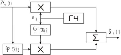 sk(t)=Аk[cos(ωkt)cos(Ωt) + cos(ωkt+0,5π)cos(Ωt+0,5π)].