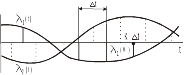 Рассмотрим один из способов формирования канальных сигналов в системе с ВРК. Сообщения λk, поступающие от источников, подвергаются дискретизации по времени так, чтобы отсчеты одного сообщения не совпадали с отсчетами другого (рис. 2.2.1,а). В соответствии с моментами отсчетов вырабатываются импульсы, параметры которых меняются в зависимости от значений сообщений сообщения в каждом отсчете. Рис. 2.2.1,б иллюстрирует систему, в которой пропорционально сообщению изменяется амплитуда импульсов. Канальные сигналы, образованные из сообщения λ1, не совпадают по времени с канальными сигналами, образованными из сообщения λ2.