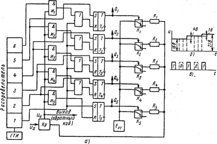 В состав преобразователя, функциональная схема которого представлена на рис. 13.15а, входят следующие узлы: распределитель, преобразователь кода в напряжение ЦАП (он состоит из цифрового регистра на триггерах T1-T5, ключей K1—K5, декодирующей сети сопротивлений и источника эталонного напряжения) и компаратор Кр, предназначенный для сравнения двух напряжений (входного сигнала их и сигнала Еэт с выхода ЦАП) и выработки выходного сигнала управления.