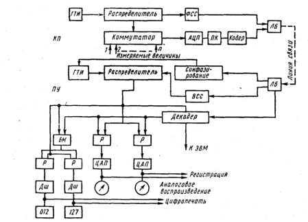 Приходящие на ПУ из линии связи, несколько искаженные из-за помех импульсы, восстанавливаются в ЛБ и поступают на декодер. Одновременно происходят синхронизация распределителей и синфазирование генераторов. После декодирования информационные символы могут поступать на блоки цифрового или аналогового воспроизведения информации или на оба сразу, а также в ЭВМ. Каждая кодовая комбинация (КК), соответствующая определенной измеряемой величине, записывается в индивидуальный регистр. При цифровом воспроизведении КК предварительно проходит через блок масштабирования. Очередность записи КК в регистры исходит от распределителя.