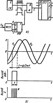 Напряжение —фаза — временной интервал—число — код. Кодирование по данной схеме представлено на рис. 13.12, а. Измеряемое напряжение поступает на фазосдвигающее устройство ФСУ, питаемое от источника переменного тока с частотой /. В зависимости от значе- • ния Ua изменяется фазовый угол между напряжениями е\ и еч на выходе ФСУ. Этот угол соответствует временному интервалу t=^/(2nf) измерителя фазового угла ИФ (рис. 13.12,6). Последний представляет собой /?5-триг-гер с инверсными входами, меняющий