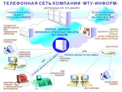 Телефонная сеть компании "МТУ-Информ" предназначена для оказания разнообразных телефонных услуг индивидуальным и корпоративным клиентам г. Москвы. Сеть базируется на принадлежащих компании электронных цифровых АТС, а в качестве транспортной среды используется собственная SDH-сеть. Номерная емкость составляет в настоящее время примерно 100000 номеров, входящих в нумерацию Московской городской телефонной сети. Таким образом, по числу обслуживаемых абонентов компания "МТУ-Информ" является вторым после АО "МГТС" оператором телефонной связи в Москве. Телефонные услуги, предоставляемые "МТУ-Информ", отличает высокое качество. Его составляющие — хорошая слышимость, надежность установления соединения, стабильность параметров сигнала и т. д. Располагая собственной транспортной сетью, равномерно покрывающей практически весь город, "МТУ-Информ" имеет возможность обеспечивать связь с абонентами МГТС, доставляя сигнал к центральной АТС компании по своей цифровой сети. Устаревшие аналоговые АТС, на которых в значительной степени происходит потеря качества сигнала, при этом не используются. Центральный узел сети "МТУ-Информ" имеет выходы на другие города и за пределы России через СП "СЦС Совинтел" и АО "Ростелеком". Благодаря высоким характеристикам телефонной сети "МТУ-Информ" ее услугами пользуются: