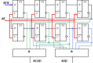 Функциональная схема (см. рис. 4.3) опознавателя синхронизма содержит регистр сдвига и дешифратор, представляющие собой две схемы совпадения, на выходе одной из которых появляются импульс в момент прихода КЦС, а на выходе другой - в момент прихода КСЦС. Схема регистра сдвига построена на 8ми тактируемых D – триггерах, а схемы совпадения кодовых комбинаций представляют собой схемы И.