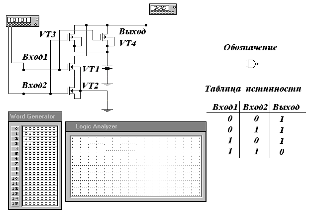 Схема И-НЕ на два входа представлена на рисунке 6.5. Рассмотрим принцип работы данного элемента. При поступлении хотя бы на один из входов напряжения логического нуля один из входных транзисторов (VT1 или VT2) закрывается, на нем образуется падение напряжения, а один из нагрузочных транзисторов (VT3 или VT4) открывается, в итоге на выходе образуется напряжение логической единицы. При поступлении на оба входа напряжения логической единицы, оба транзистора VT1 и VT2 открываются, а транзисторы VT3 и VT4 закрываются, и выход оказывается подключен к «земле», другими словами на выходе действует напряжение логического нуля.