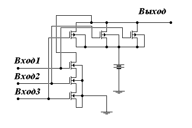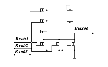 Иногда требуются схемы И-НЕ с большим количеством входов. Для построения таких схем достаточно добавить по два транзистора на каждый вход, транзистор п-типа подключить последовательно другим транзисторам п-типа, а транзистор р-типа подключить параллельно другим транзисторам р-типа. Схема ИЛИ-НЕ на три входа изображена на рисунке 6.6. Принцип работы данной схемы не отличается от принципа работы схемы ИЛИ-НЕ на два входа.