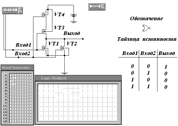 Ячейка ИЛИ-НЕ на два входа представлена на рисунке 6.3. Рассмотрим принцип работы данного элемента. При поступлении напряжения логической единицы на один из входов схемы, один из входных транзисторов (VT1 или VT2) открывается, а соответствующий ему нагрузочный транзистор (VT3 или VT4) закрывается, в результате выход оказывается подключенным к «земле», т.е. на выходе образуется логический ноль. При поступлении на оба входа схемы напряжения логического нуля, транзисторы VT1 и VT2 закрываются, а нагрузочные транзисторы наоборот открываются, в результате на закрытых транзисторах образуется падение напряжения и на выход схемы поступает напряжение логической единицы. На осциллограмме (см. рис. 6.3) представлены эпюры напряжений на входах и выходе схемы, иллюстрирующие работоспособность данного элемента, на этом же рисунке представлена таблица истинности элемента ИЛИ-НЕ.