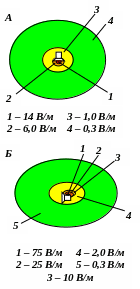 Рис. 9.1 Зоны компьютерного излучения А - вид сверху; Б - вид сбоку. Цифрами обозначены зоны и даны величины напряженности электромагнитных полей в них.
