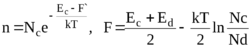 Поскольку при температурах близки к 0К все донорные уровни заполнены электронами (f = 1), а зона проводимости свободна от электронов (f = 0), то уровень Ферми (f = 1/2) должен находиться между этими двумя уровнями (функция Ферми-Дирака непрерывна), т.е. в запрещенной зоне. При повышении температуры электроны начинают переходить с донорного уровня зоны в зону проводимости, переходами из валентной зоны для температурной области 1 можно пренебречь. Энергетическая конфигурация для этого случай такая же как для собственного полупроводника с шириной запрещенной зоны Ec-Ed, в котором вместо эффективная плотность состояний в валентной зоне равна Ed, поэтому для расчета концентрации электронов и уровня Ферми в этой области мы можем воспользоваться формулой (1.13), сделав соответствующие замены: