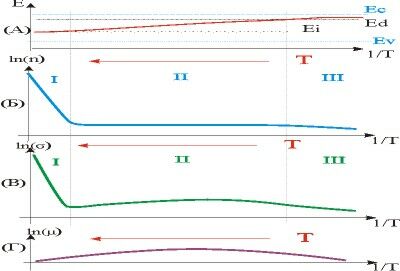 В области высоких температур, там, где доминируют межзонные переходы и собственная концентрация носителей больше примесной ni>>nпр полупроводник ведет себя как собственный (область I). В области низких температур (область III), там где примесь не ионизована уровень Ферми должен находиться выше донорного уровня (вероятность заполнения электронами больше 1/2). По мере того, как температура повышается доноры отдают электроны в зону проводимости и постепенно полностью ионизуются (область II). Область II принято называть областью истощения примеси, поскольку все атомы доноров отдали свои электроны, а концентрация собственных электронов все еще очень мала, концентрация электронов в этой области остается постоянной и примерно равной концентрации примесных атомов. Именно эта температурная область и является основной областью работы значительной части полупроводниковых диодов и Поскольку в области II концентрация носителей изменяется незначительно, то в электропроводности (кривая В) становится заметен вклад подвижности, что приводит к некоторому падению электропроводности с ростом температуры (что вообще говоря не характерно для полупроводников) в некотором интервале температур за счет доминирования рассеяния на колебаниях решетки. Затем с повышением температуры имеет место переход к собственной проводимости, концентрация электронов и электропроводность начинают возрастать экспоненциально с температурой.