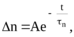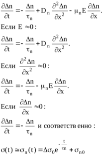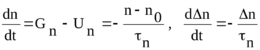 где G и U - соответственно скорость генерации и скорость рекомбинации (число электронов генерируемых или рекомбинирующих в единице объема в единицу времени), n - концентрация электронов в данный момент времени, n0 - равновесная концентрация электронов, G - генерационный член, τn - характеристическое время жизни, Δn - избыточная над равновесной концентрация носителей заряда. Решение этого уравнения имеет вид: