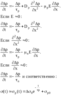 Приведенный пример демонстрирует эффективность уравнения (35) при анализе процессов в различных областях полупроводниковых приборов. Так биполярные полупроводниковые приборы (диоды, транзисторы, тиристоры и др) состоят из чередующихся областей p и n типа. Поэтому для анализа процессов в различных областях используются уравнения для неосновных носителей заряда.