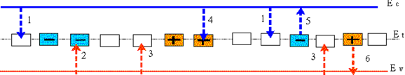 На рисунке 13 показаны возможные процессы при взаимодействии носителей из разрешенных зон с ловушками: захват электрона (1) с последующей его рекомбинацией (2), захват дырки (3) с последующей ее рекомбинацией (4), эмиссия захваченного электрона (5), эмиссия захваченной дырки (6).