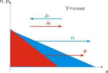 Диффузионный поток направлен из области высокой концентрации в область низкой концентрации. Свободные носители заряжены. Следовательно любое их перемещение, в том числе и диффузионное, приводит к появлению электрических токов, которые так и будем называть диффузионными.