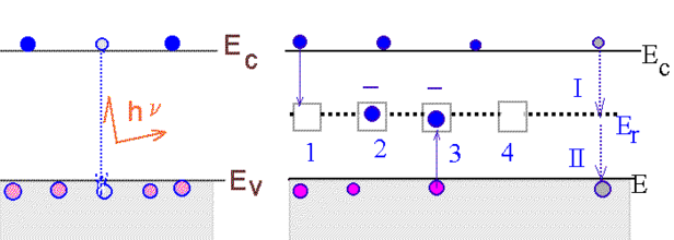 Таким образом, переход электрона из зоны проводимости в валентную зону происходит в два этапа: I- из зоны проводимости на рекомбинационный уровень, II - с рекомбинационного уровня в валентную зону (см. верхний рисунок)