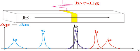 Рис. 1.26. Дрейф инжектированного светом электронно-дырочного импульса в электрическом поле.