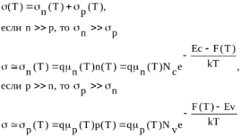 Анализ соотношений (1.50) показывает, что изменение концентрации от температуры зависит экспоненциально от изменения положения уровня Ферми. Вообще уровень Ферми следует рассматривать как хороший индикатор процессов, происходящих с носителями заряда. Если уровень Ферми приближается к зоне проводимости значит возрастает концентрация электронов и σn, при этом концентрация дырок и соответственно σp падает.