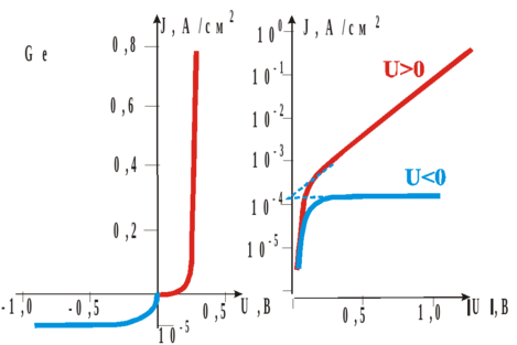 Формула (2.6) удовлетворительно описывает ВАХ pn перехода и характеристики диода при малых токах, когда падение напряжения на прилегающих к переходу областях значительно меньше, чем падение напряжения на самом переходе. На рис. 2.10. показаны вольтамперные характеристики (слева в линейном масштабе, справа в логарифмическом), построенные по (2.6) при значении Js = 2 10-4 A .