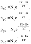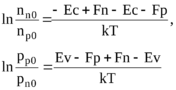 Используя соотношения, полученные в предыдущем разделе запишем соотношения для расчета основных и неосновных носителей заряда в p и n областях через значения уровня Ферми в соответствующих областях (рис. 2.6). Обозначим равновесные концентрации индексом 0.